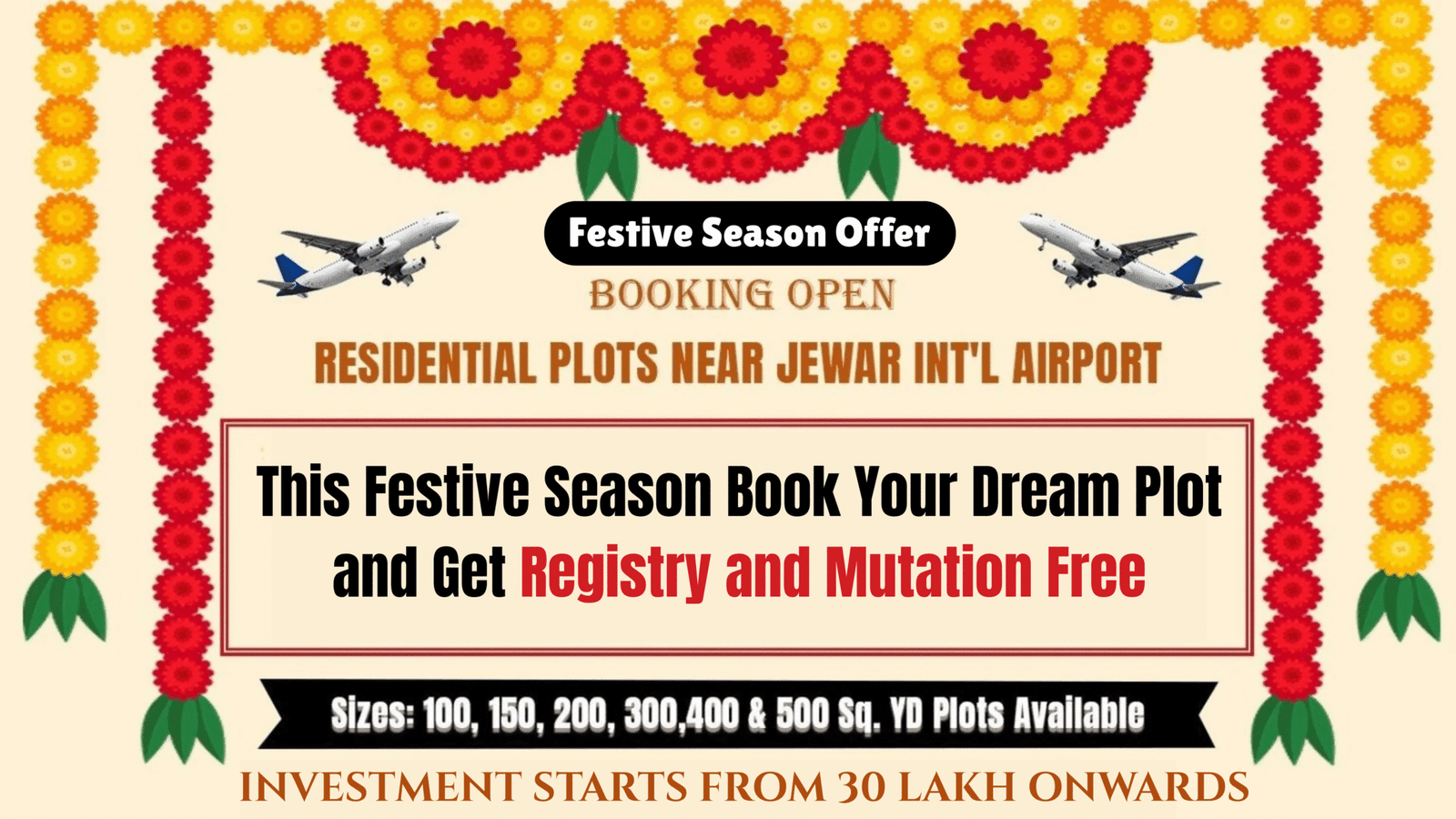 Book your dream residential plot near Noida International Airport this festive season and enjoy free registry and mutation benefits. With plot sizes ranging from 100 to 500 sq. yards, this is the perfect opportunity to invest in your future. Booking is now open, and investments start from just ₹30 lakh onwards. Don’t miss this limited-time festive offer!